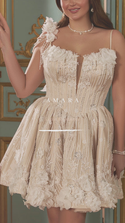 Amara is unapologetically unique — a mini that celebrates modern romance with a touch of extravagance. Her lace is delicate yet daring, cut into an asymmetrical silhouette that feels effortlessly stylish. Strands of pearls shimmer across her design, while a single strap blooms with floral accents, embodying both elegance and individuality. She’s for the bride who wants to stand out and still feel completely herself.