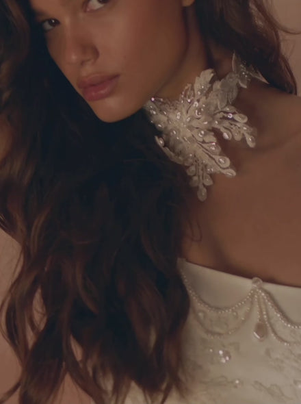 Celia is artistry in motion. Her lowered Chantilly lace corset sculpts the waist with quiet precision, while soft organza draping breathes life across the bust and skirt, adding air and depth to every step. A delicate bow at the hip becomes her signature — graceful, deliberate, unforgettable. Finished with matching lace gloves and a choker, Celia evokes a world of refined couture elegance — for the bride who finds strength in softness and poetry in detail.