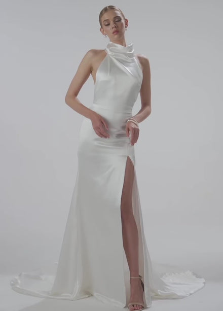Denise is a straight-cut satin gown designed for simplicity with a twist. The floor-length silhouette extends into a soft train, while a front slit adds movement and shape through the skirt.