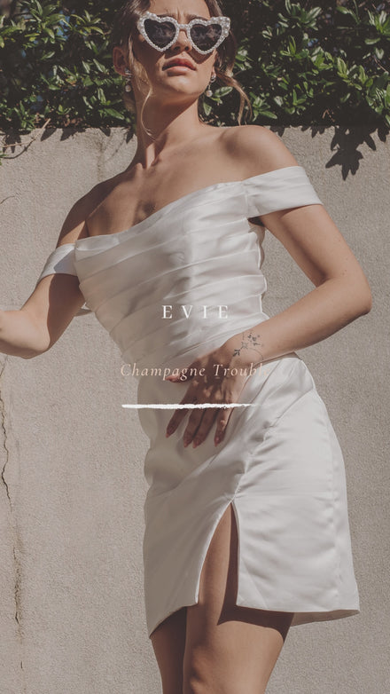 She’s the kind of dress that speaks in glances and gentle moments. An off-the-shoulder mini with pleated satin wrapping diagonally across the body, Evie creates a timeless, flattering shape that feels both classic and fresh. Perfect for the bride who wants to feel graceful, poised, and just a little bit playful.