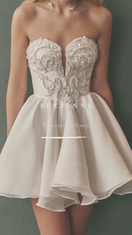 Lucienne is light as air and full of romance. Her voluminous organza skirt billows with playful movement while a structured corset, adorned with intricate embellishments, sculpts the figure in delicate detail. Finished with a pearl-trimmed hem for a flourish of luxury, she’s dreamy, modern, and unforgettable — the kind of dress that makes an entrance without trying too hard.