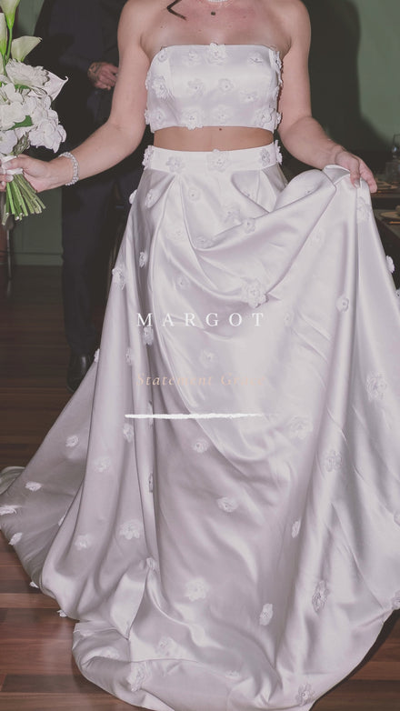 Designed as a two-piece, Margot pairs a structured boob tube top with a floor-sweeping skirt. The full skirt flows into an extended train, giving every step intention and every entrance impact. Modern edge meets timeless drama, and the result is quiet power that owns the room without ever shouting.