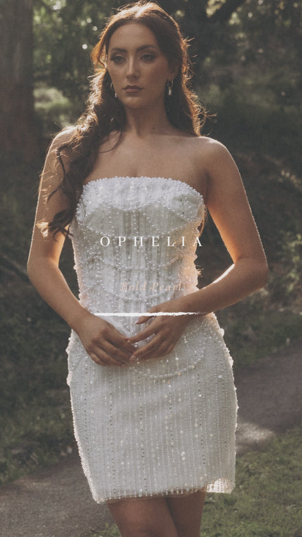 Ophelia is strapless, structured, and unapologetically luminous — an A-line mini covered head to toe in pearls, sequins, glitter, and beads. Extra, yes, but in that quiet, classy way that makes people lean in for a second look. Her boned corset and dropped waist sculpt the figure, while the mini skirt keeps her playful. She doesn’t shout — she sparkles. And she knows it.