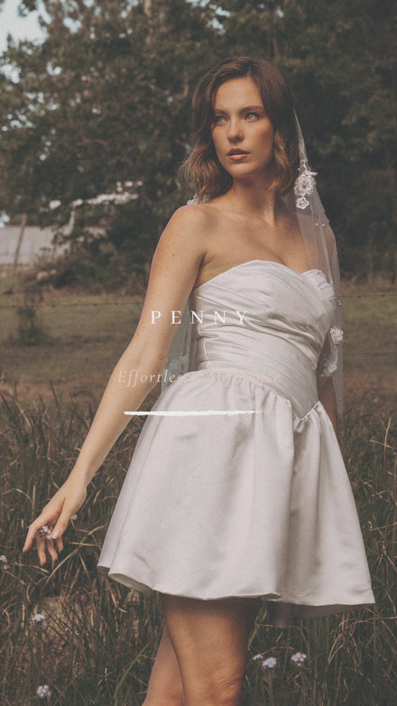 Simple but never boring, timeless yet fresh, she’s cut from thick luxe satin that gives structure without stiffness. Her A-line shape sits just above the knee, moving beautifully whether you’re spinning on the dance floor or stepping out for golden hour photos. A soft, romantic neckline frames the face, but the real magic is in her bandage-style corset — modern, sculpted, and flattering in all the right ways. She hugs without squishing, shapes without shouting, and keeps you feeling like a million bucks without needing constant adjusting.