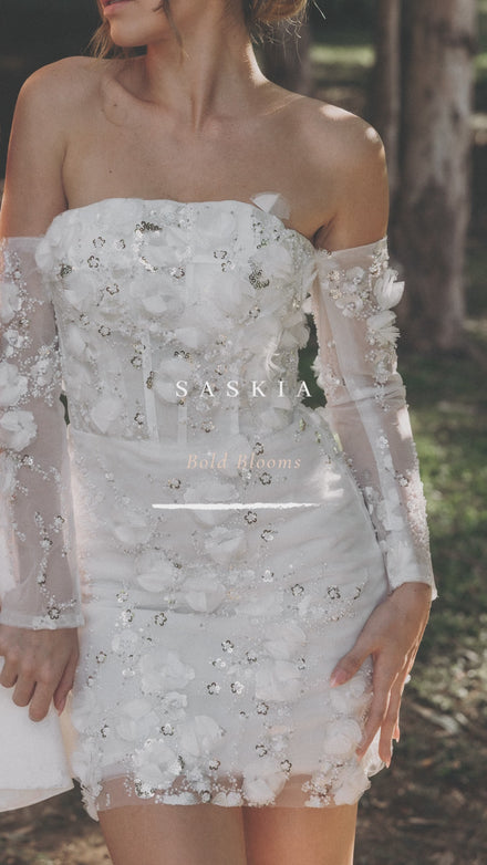 Covered in dimensional florals, pearls, and sequins that shimmer with every step, Saskia is textured, luminous, and unapologetically extra. And yes, she comes with matching gloves — because iconic doesn’t happen halfway. She’s for the bride who wants to be remembered, who wants to feel like a piece of art, and who wants to twirl, sparkle, and move without sacrificing a single ounce of comfort or cool.