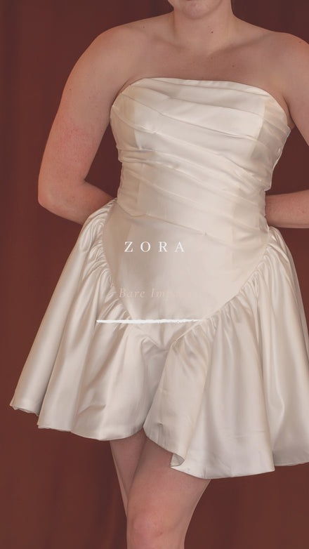 A strapless mini with a clean, straight neckline and bold dropped waist, she brings a fresh, fashion-forward edge. Her corset-style bodice sculpts with ease, while the bunched mini skirt adds just the right amount of volume. Flirty, fun, and made for dancing, Zora is for the bride who wants a reception dress with personality — cheeky, glam, and completely herself.